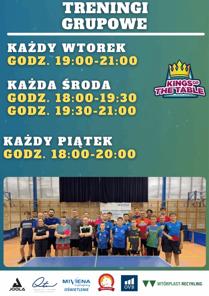 Treningi grupowe tenisa stołowego to idealne miejsce na podniesie swoich umiejętności podczas gry z zawodnikami na swoim poziomie pod czujnym okiem trenerów.